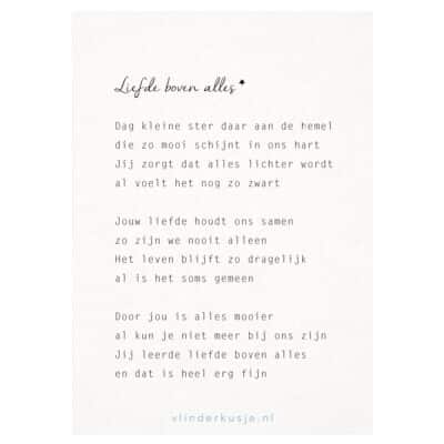 Vlinderkusje is opgericht na een persoonlijk verlies van Anja, eigenaar van de shop. Ze schrijft alle gedichten zelf en is ook verantwoordelijk voor alle ontwerpen van ons merk Vlinderkusje. Omdat ze als geen ander weet hoe fijn het is om liefde en troost te ontvangen tijdens de moeilijkste periode in haar leven én omdat ze vond dat er te weinig liefdevolle items en troostkado’s te vinden zijn rondom verlies (van een kind) is ze gestart met deze troostwinkel.