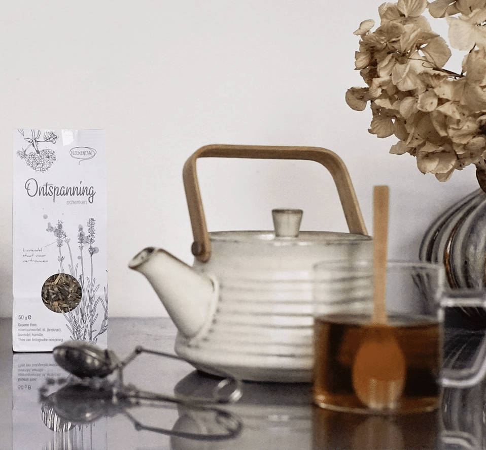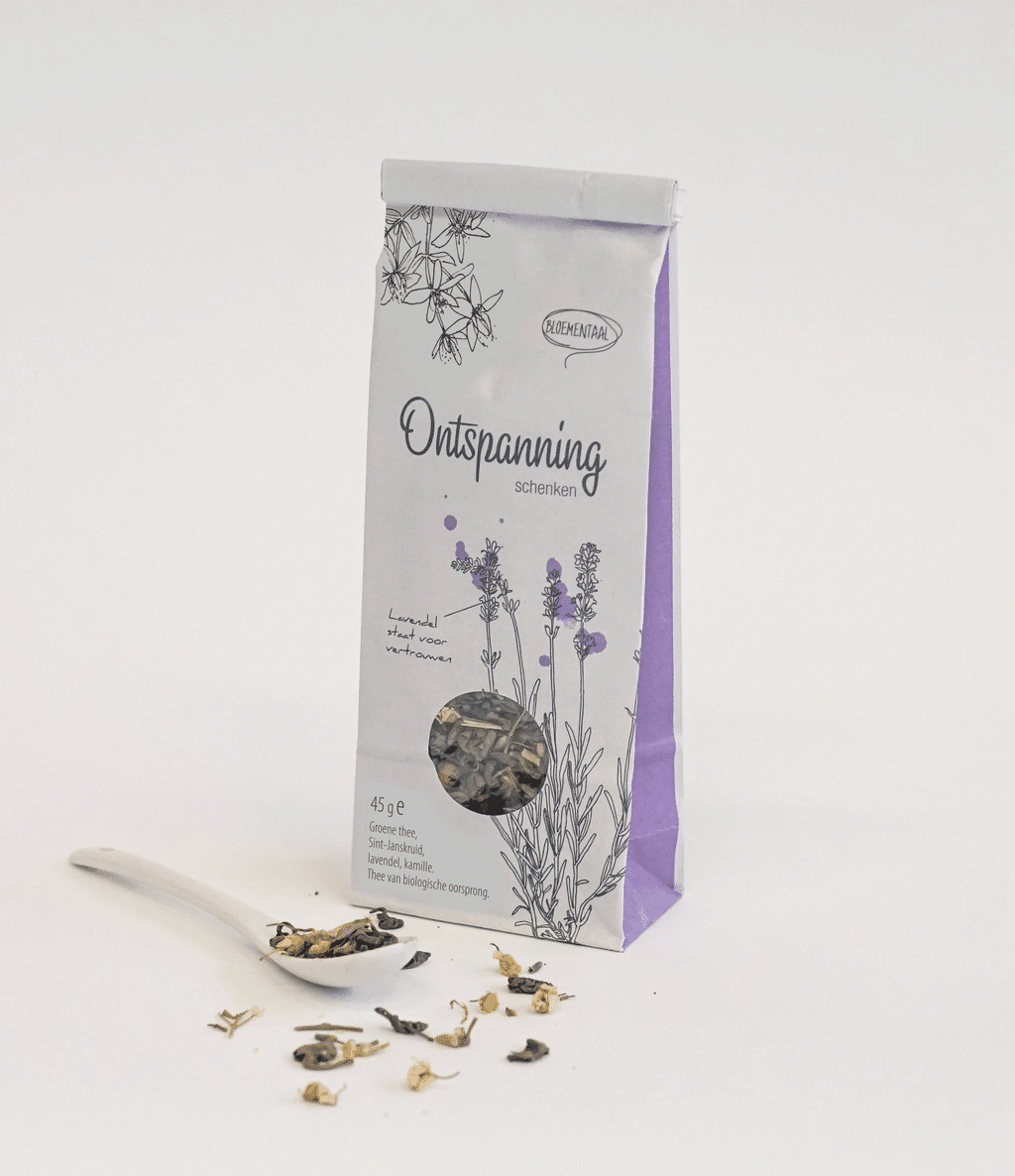 - Ontspanning schenken: Groene thee met lavendel dat staat voor vertrouwen. Ingrediënten: Groene thee, valeriaanwortel, st janskruid, lavendel en kamille.