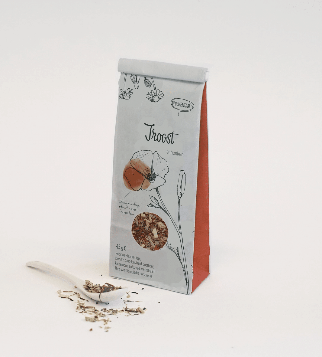- Troost schenken: Rooibos met slaapmutsje (goudpapaver) dat staat voor ’troosten’ en kamille dat staat voor ‘kracht bij tegenspoed’. Ingrediënten: Rooibosthee, slaapmutsje, kamille, Sint-Janskruid, zoethout, kardemom, anijszaad, venkelzaad..