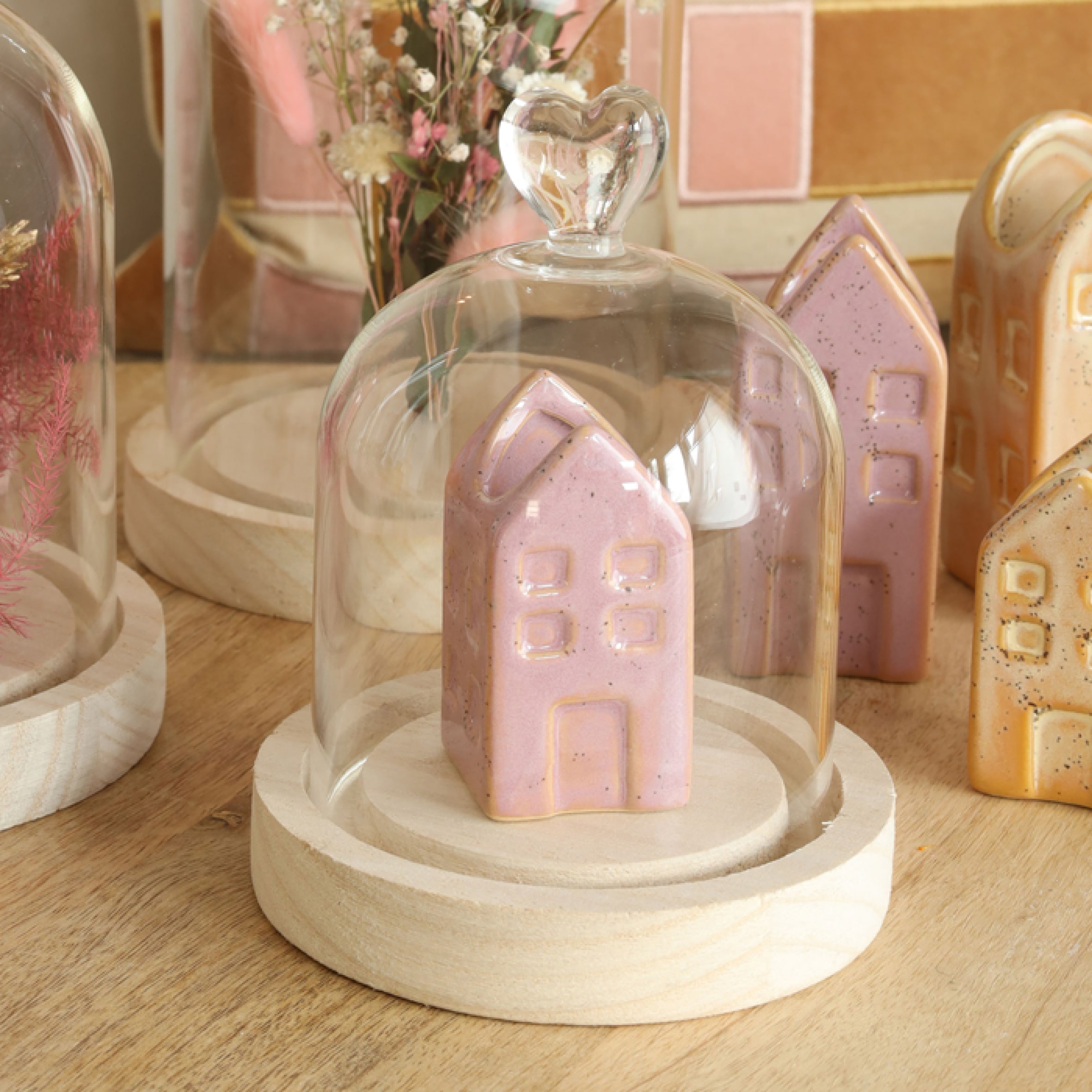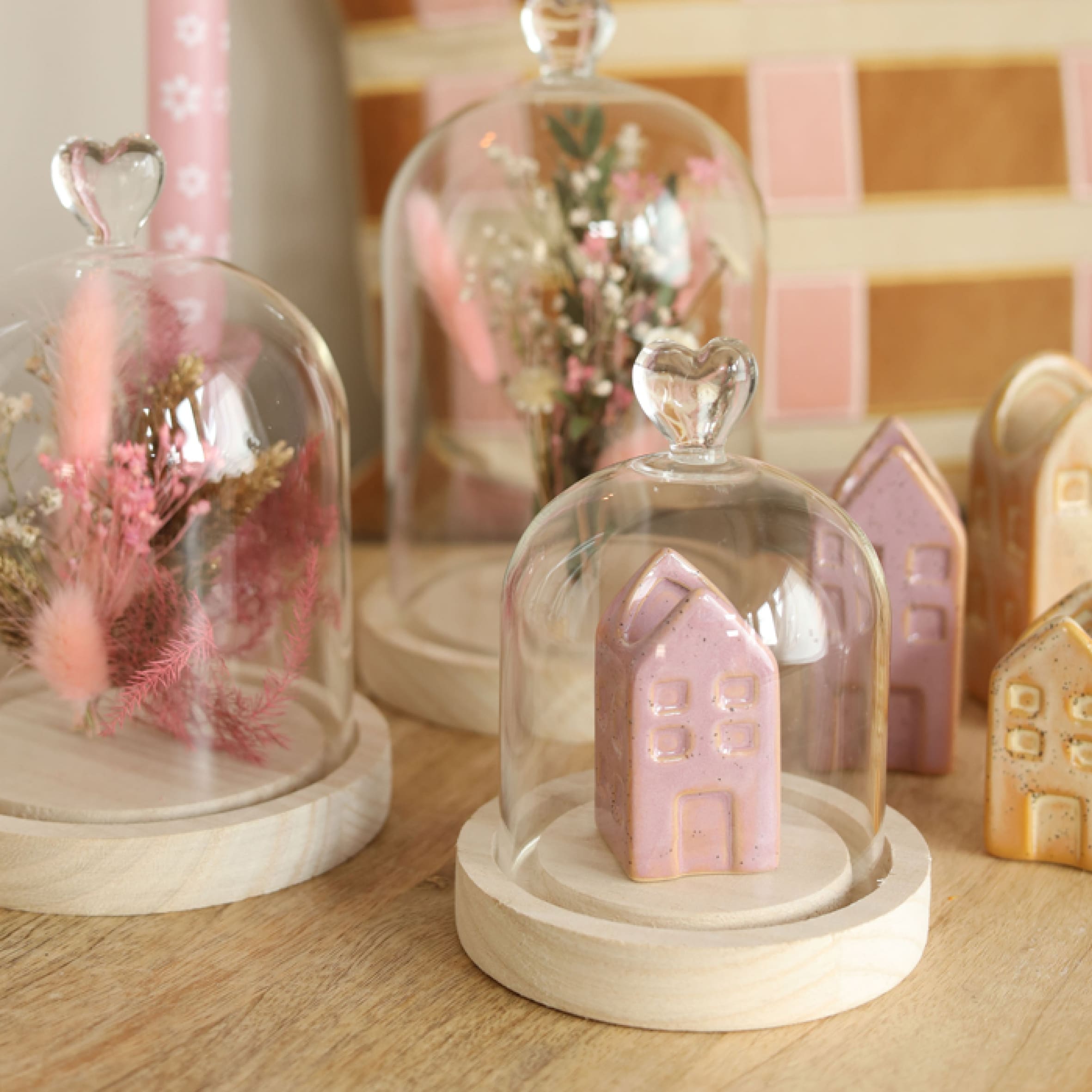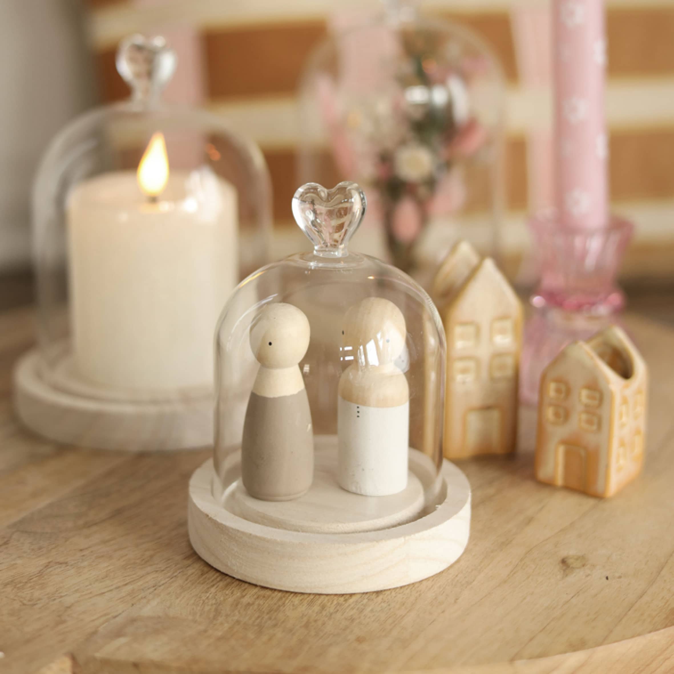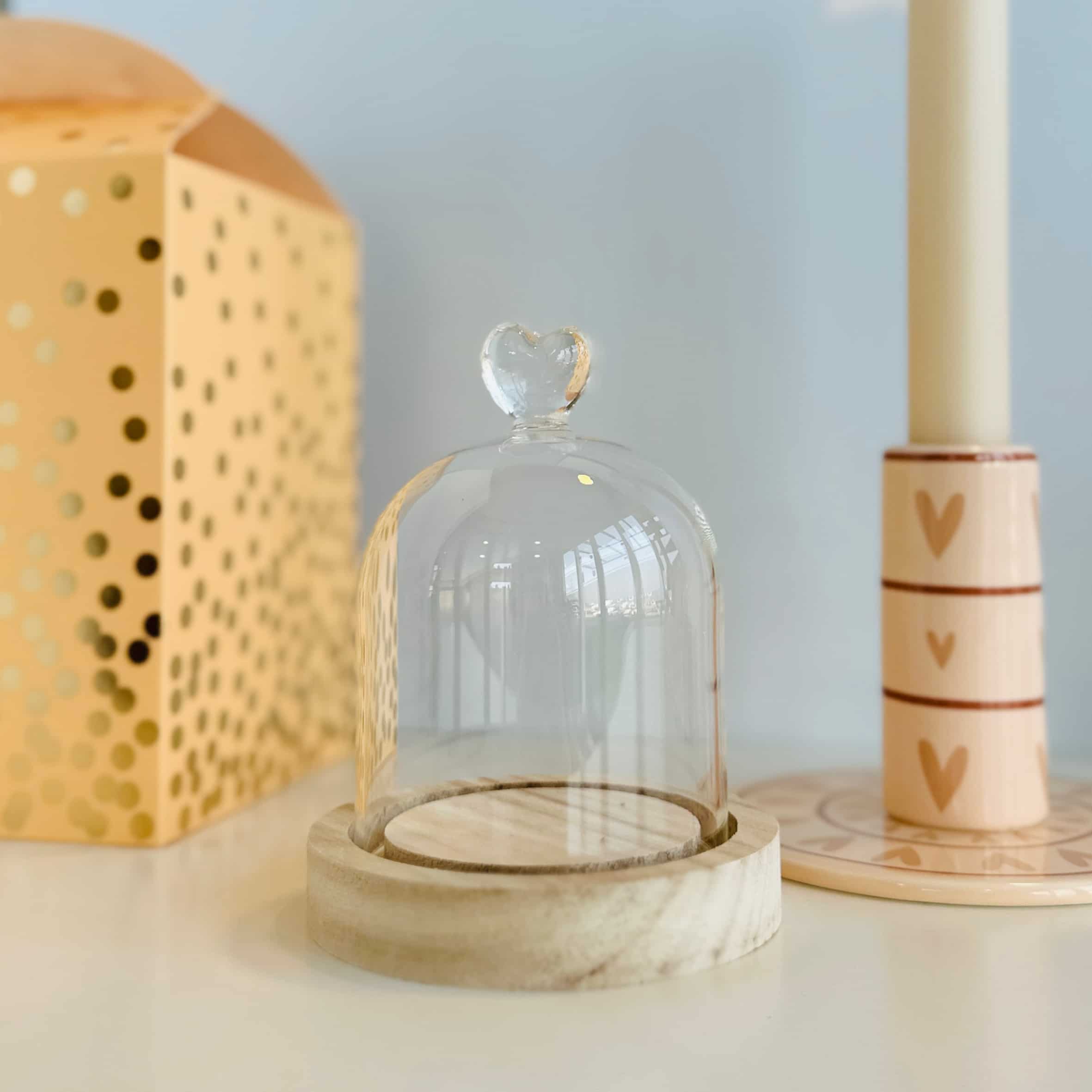 Glazen stolp met een hartje om bijzondere herinneringen en andere spulletjes in te zetten op een speciale plek in huis. De stolp is beschikbaar in 3 formaten: 10×12, 12×15 en 12×18 cm.
