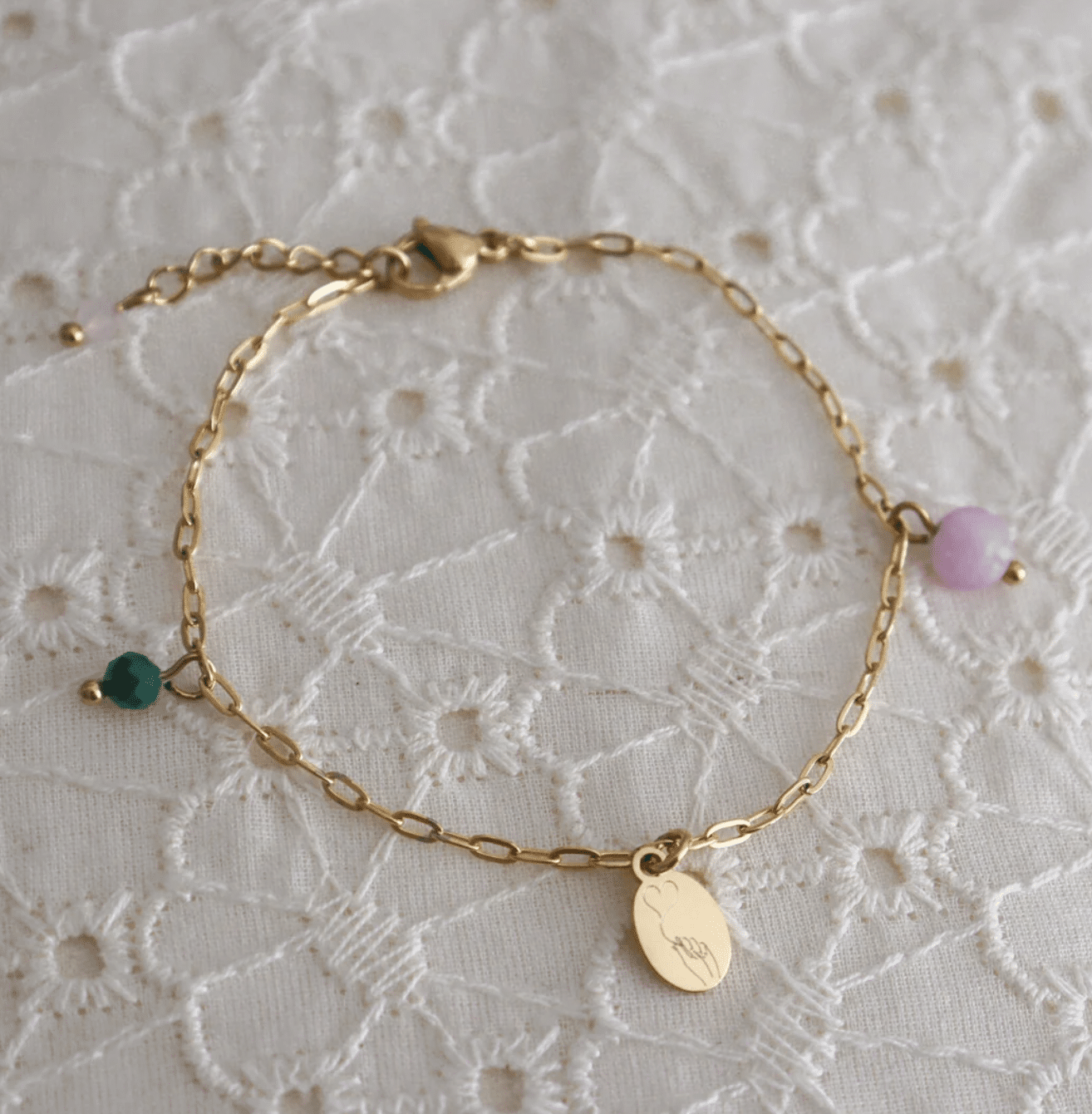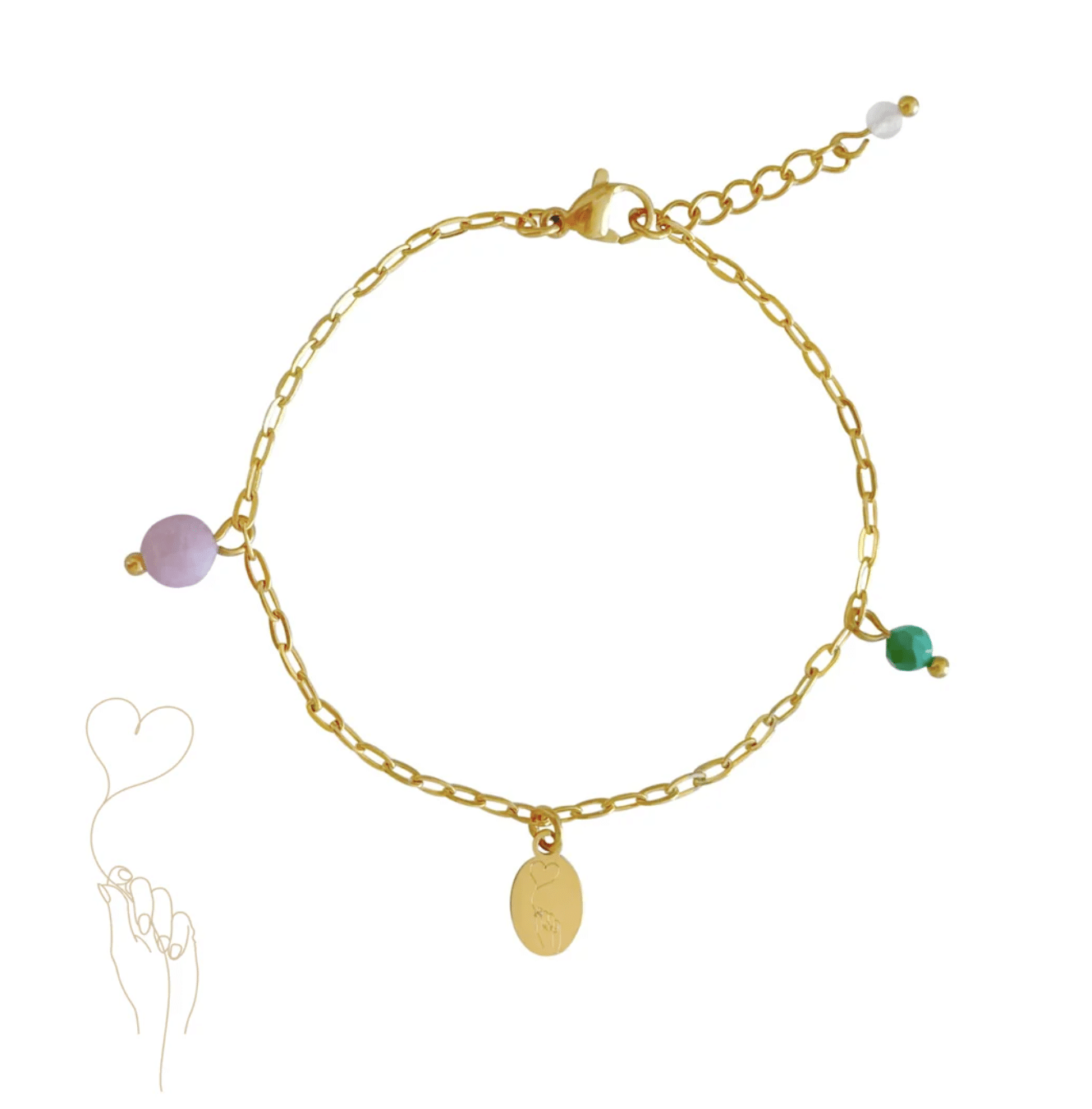 Hart Onder De Riem Armband, gemaakt van stainless steel. Aan het armbandje hangt een bedeltje met een gravure, op deze gravure zie je een hand die een hartjes ballon vasthoudt. Aan het armbandje hangt een facet geslepen Malachiet steentje en Chalcedoon steentje. Leuk detail is het Rozenkwarts steentje aan het verlengkettinkje.