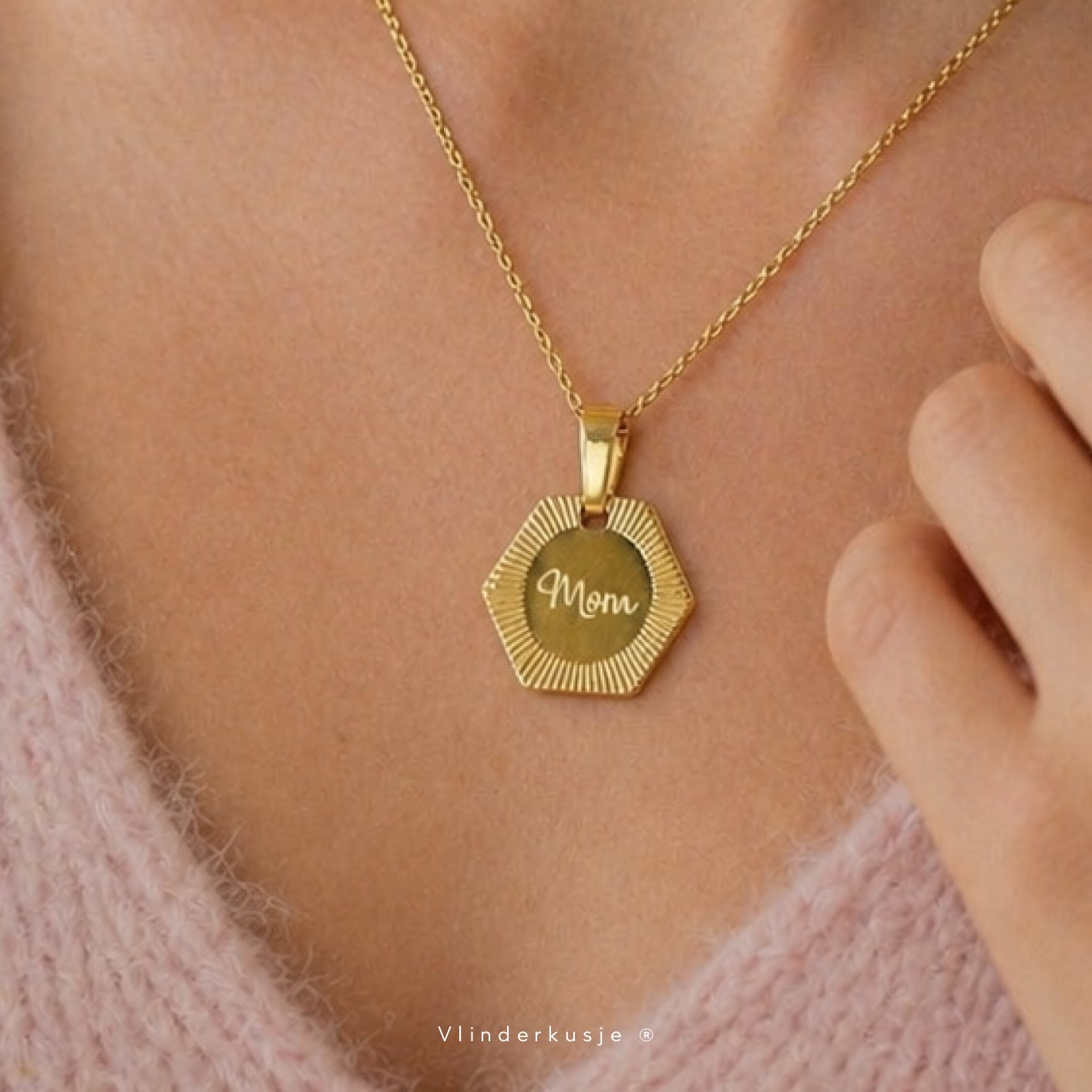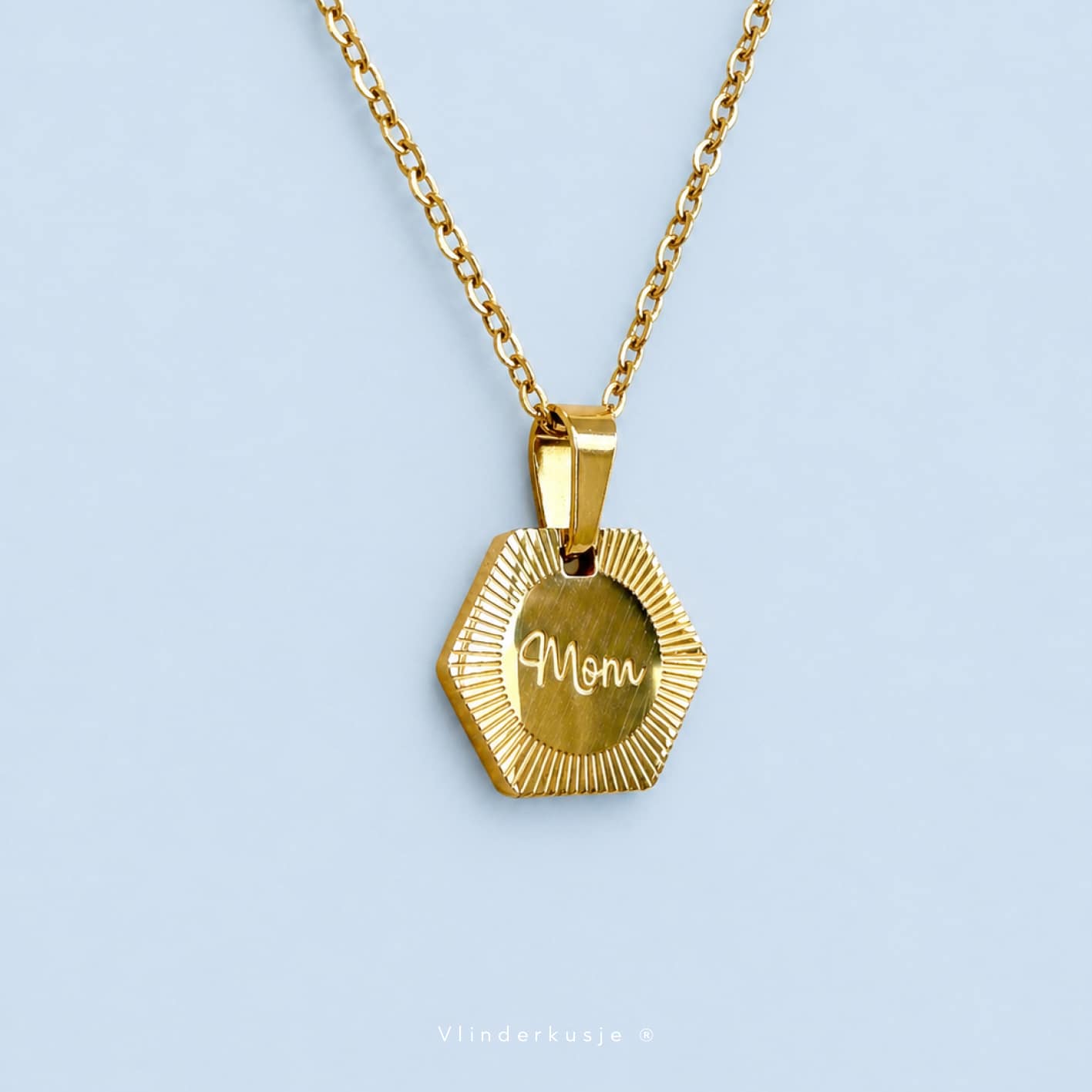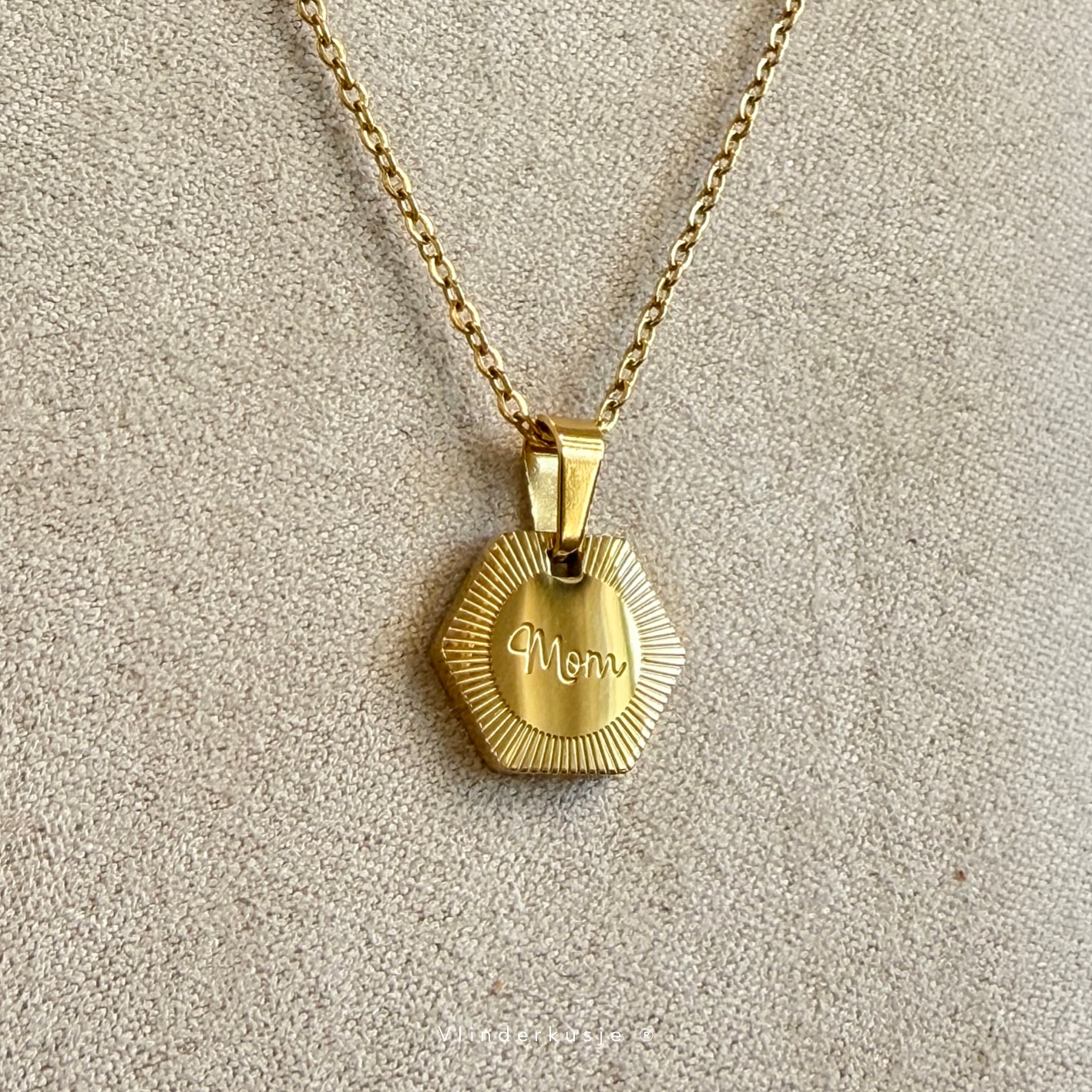 Een lieve goudkleurige ketting van RVS met een bedeltje met gravering ‘Mom’. Het kettinkje wordt geleverd in een lief zakje met een kaartje met het gedichtje ‘Ik draag je’.