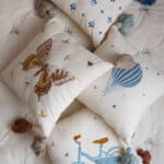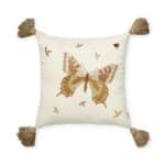 Een verfijnd geborduurd kussen met elegante kwastjes en liefdevolle illustraties met een vlinder. Gemaakt van zacht biologisch katoen met een fijne weefstructuur.