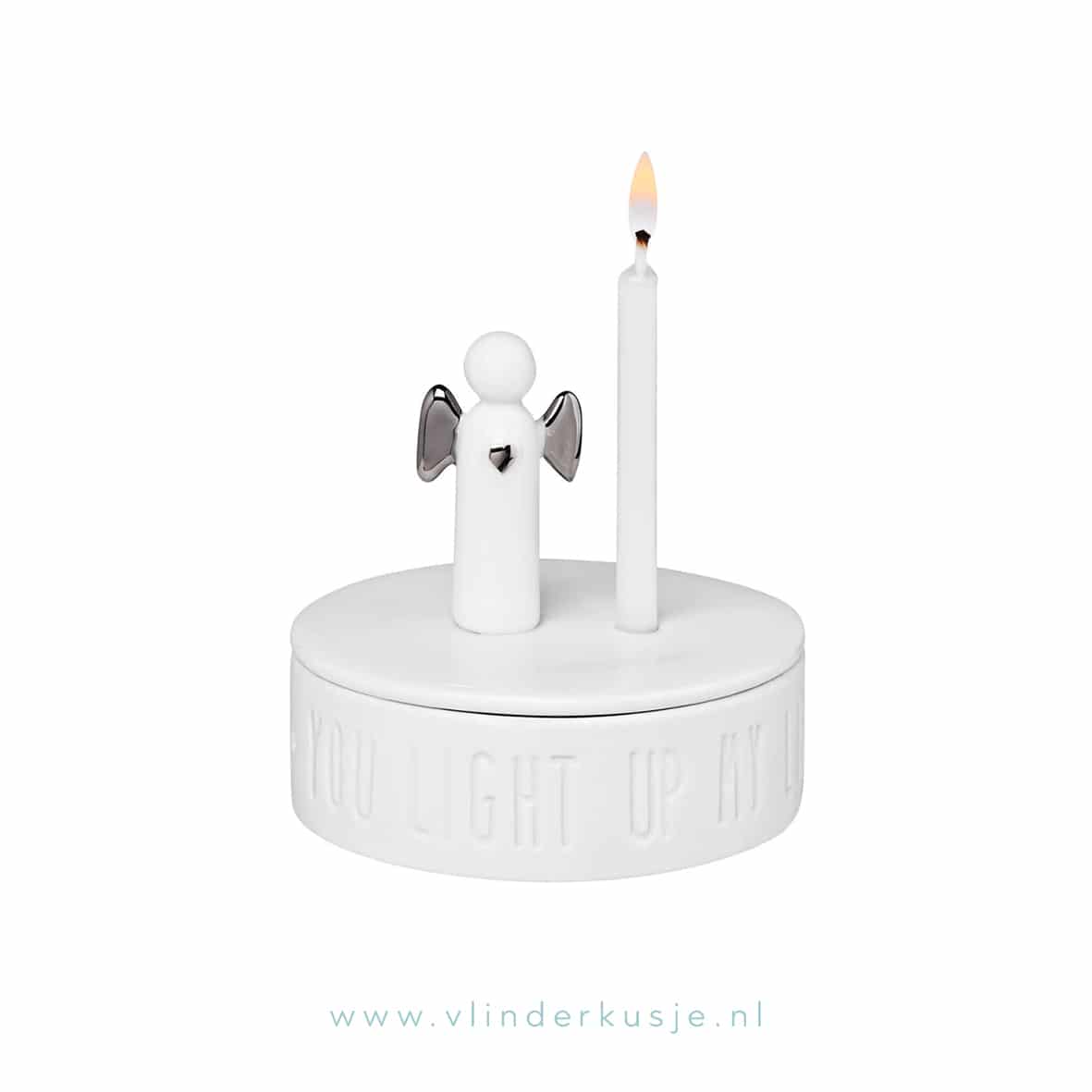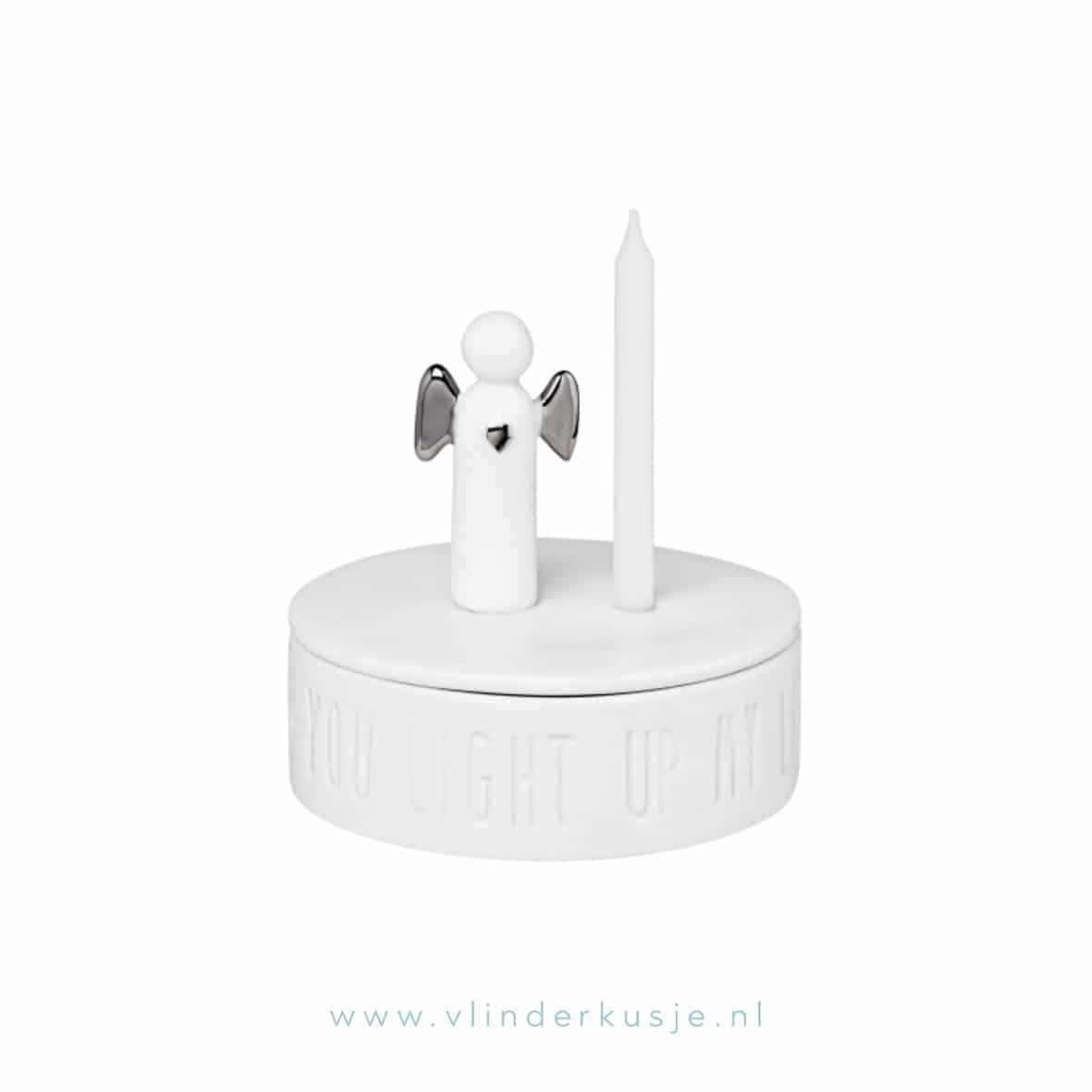 Een klein schaaltje met deksel waar je een mini lichtje in kunt zetten. Je kunt er waardevolle schatten of kaarsjes in bewaren, en af en toe een lichtje aansteken bij bijzondere momenten, om herinneringen te vieren en/of te herdenken. Rondom het schaaltje staat de tekst; ‘You light up my life’