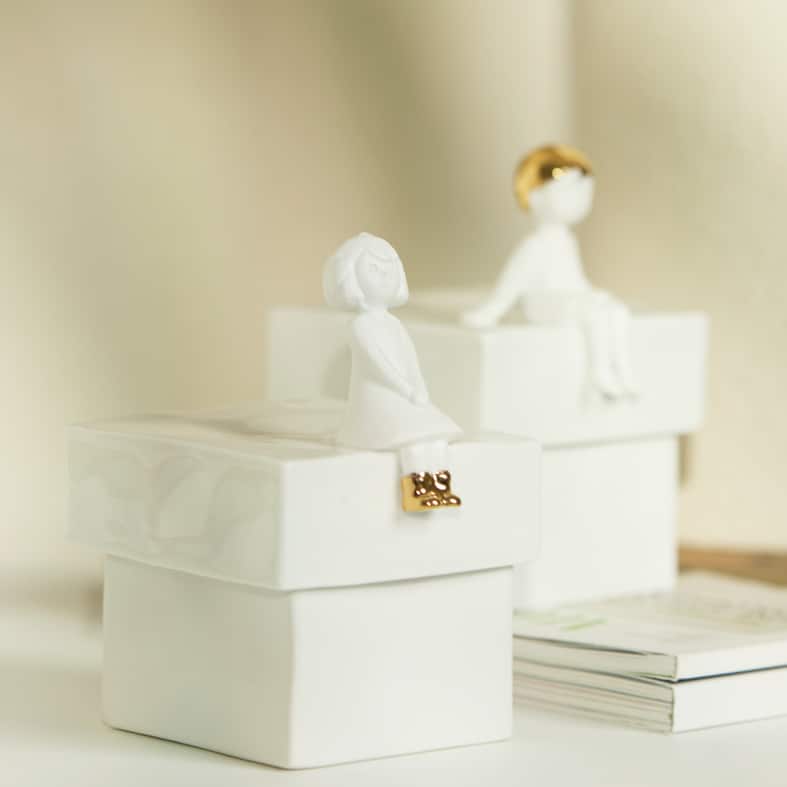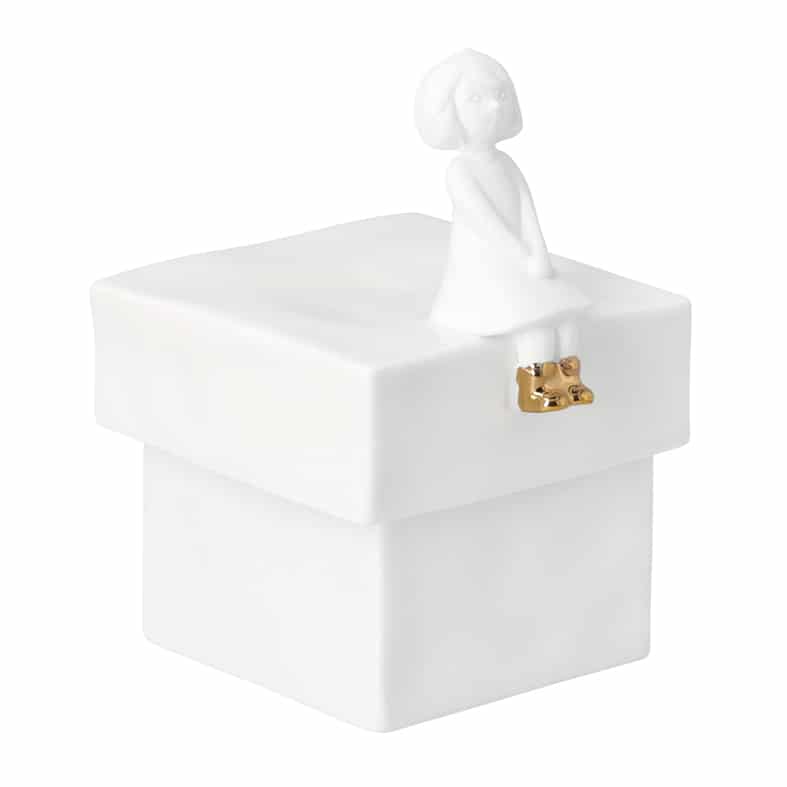 Lief potje van keramiek, met een lief meisje erop met gouden voetjes. Prachtig om bijzondere schatten in te bewaren en op een mooie plek in huis te zetten!