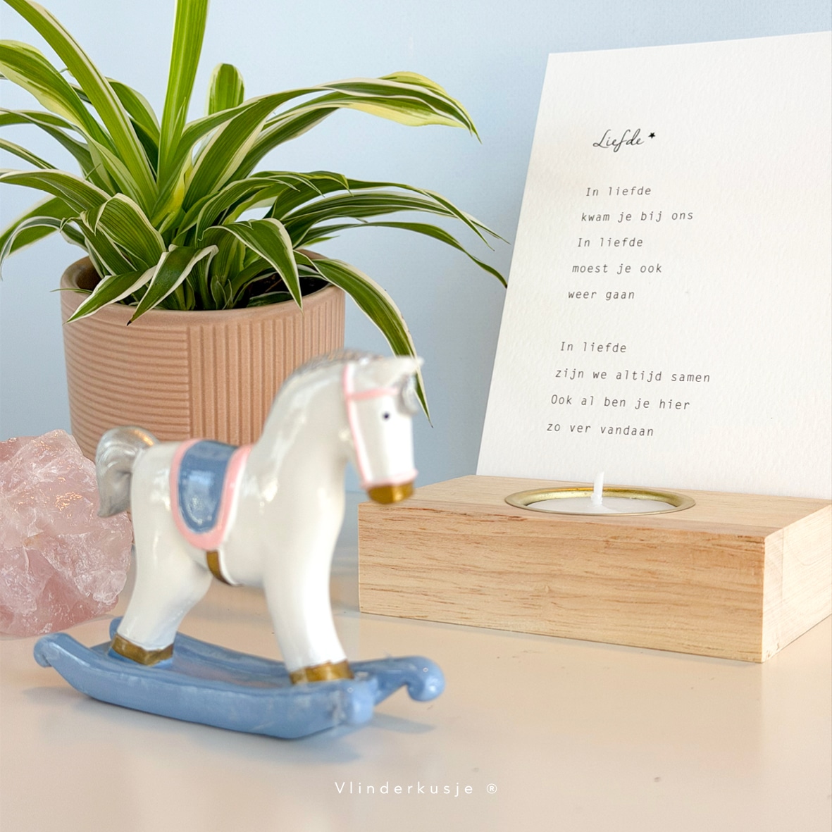 Een prachtig hobbelpaardje in pastelkleuren voor op een bijzonder gedenkplekje in huis voor een baby of kind. Omdat de liefde altijd blijft bestaan!