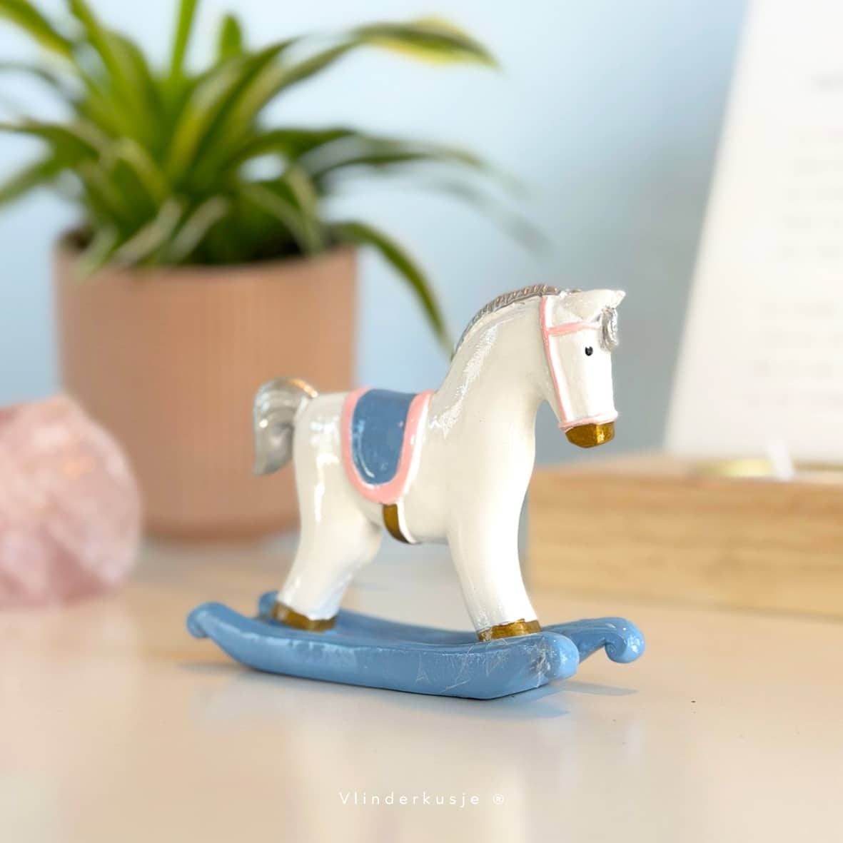 Voor iedereen is het anders, iedereen heeft zijn eigen behoeftes en wensen, en ik weet ook niet of anderen dit symbool zullen begrijpen. Maar toen ik dit lieve hobbelpaardje zag en deze zachte kleuren dacht ik gelijk aan het hemelspeelgoed van Boris. Daarom is dit liefje vanaf nu ook verkrijgbaar bij Vlinderkusje, voor op een bijzonder plekje in huis…