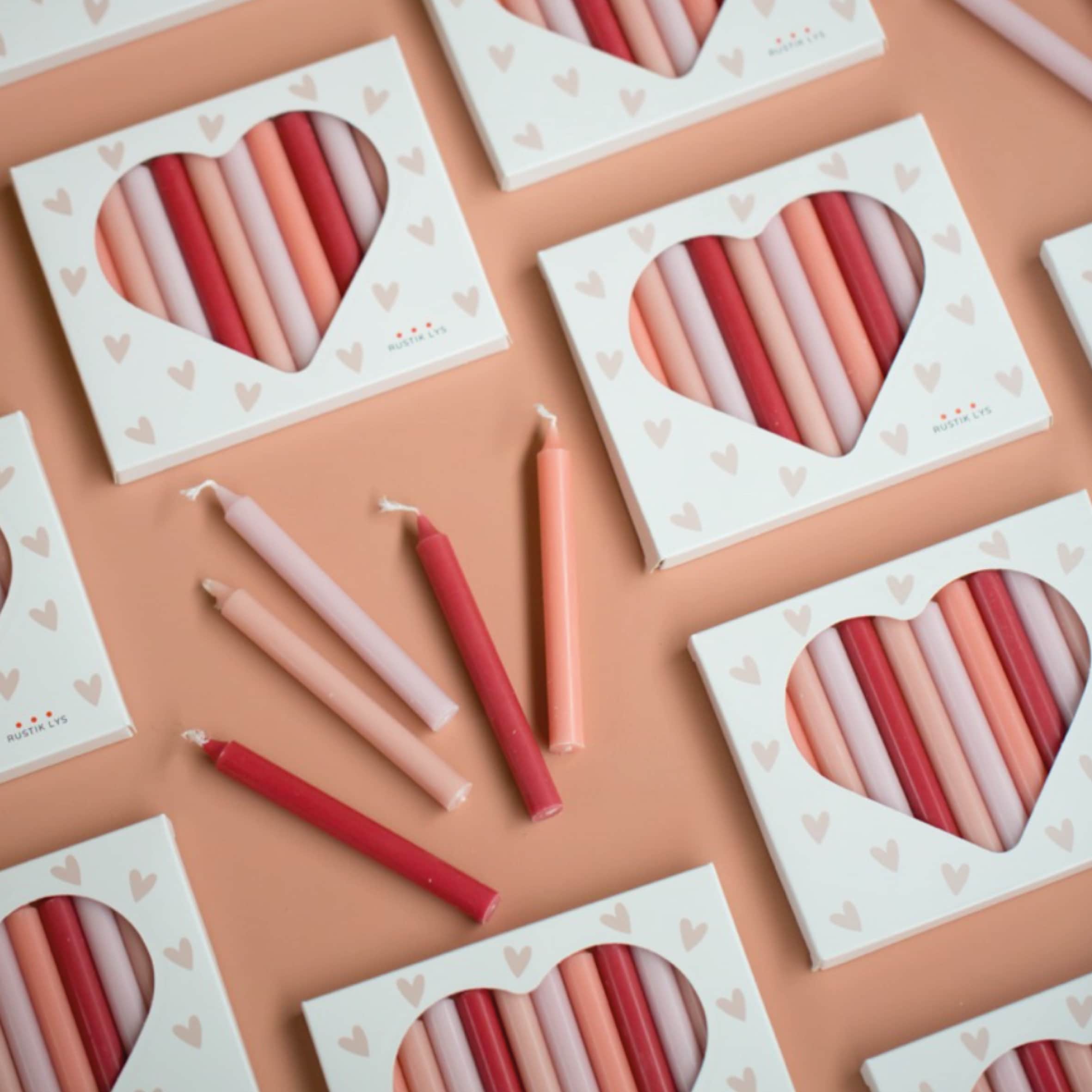 12 kleine potloodkaarsjes in een doosje met hartjes in roze en rood tinten