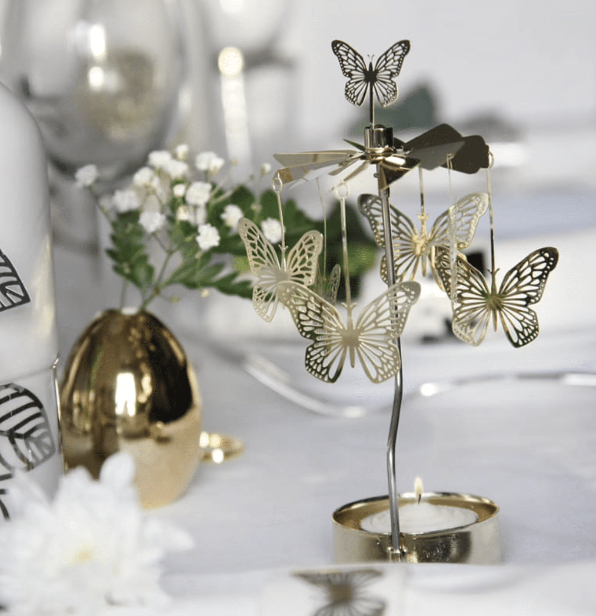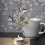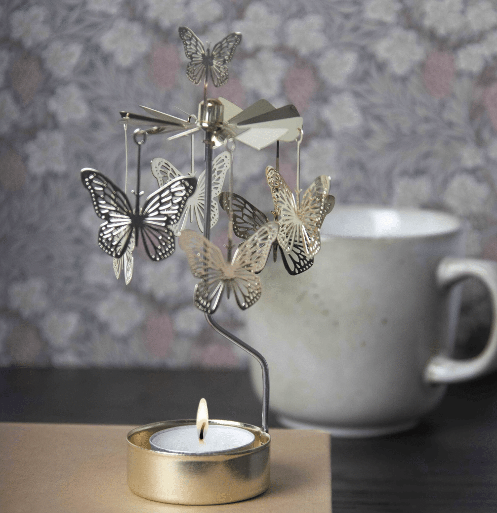Een prachtig roterend lichtje van metaal in een geschenkdoosje. Het carousselletje gaat draaien wanneer de warmte van het aangestoken kaarsje omhoog stijgt. Het lichtje is ongeveer 16 cm hoog en verkrijgbaar in verschillende designs.
