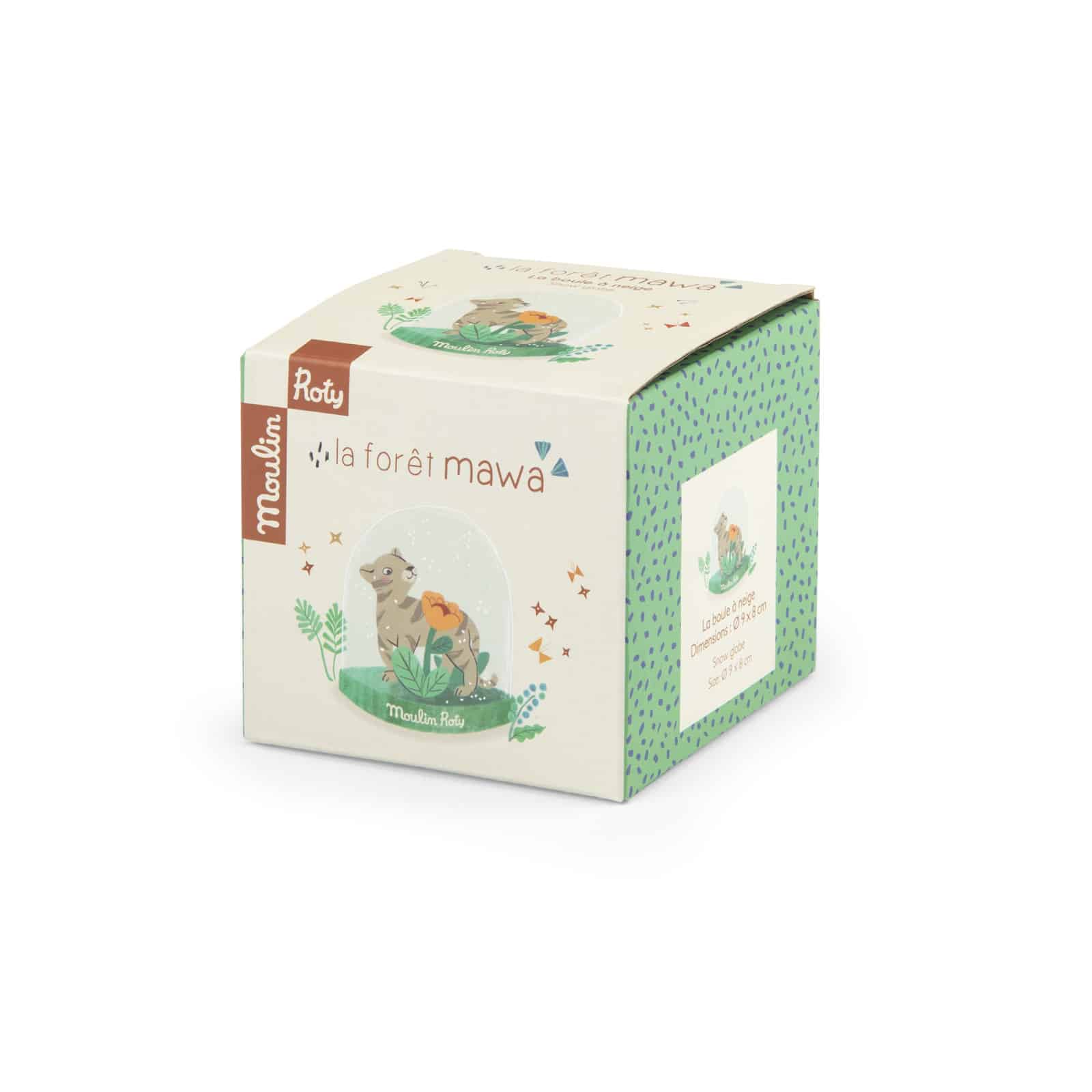 Deze sneeuwbol is van Moulin Roty en komt uit de ‘La forêt Mawa’ collectie, met bosdiertjes en andere avontuurlijke dieren.