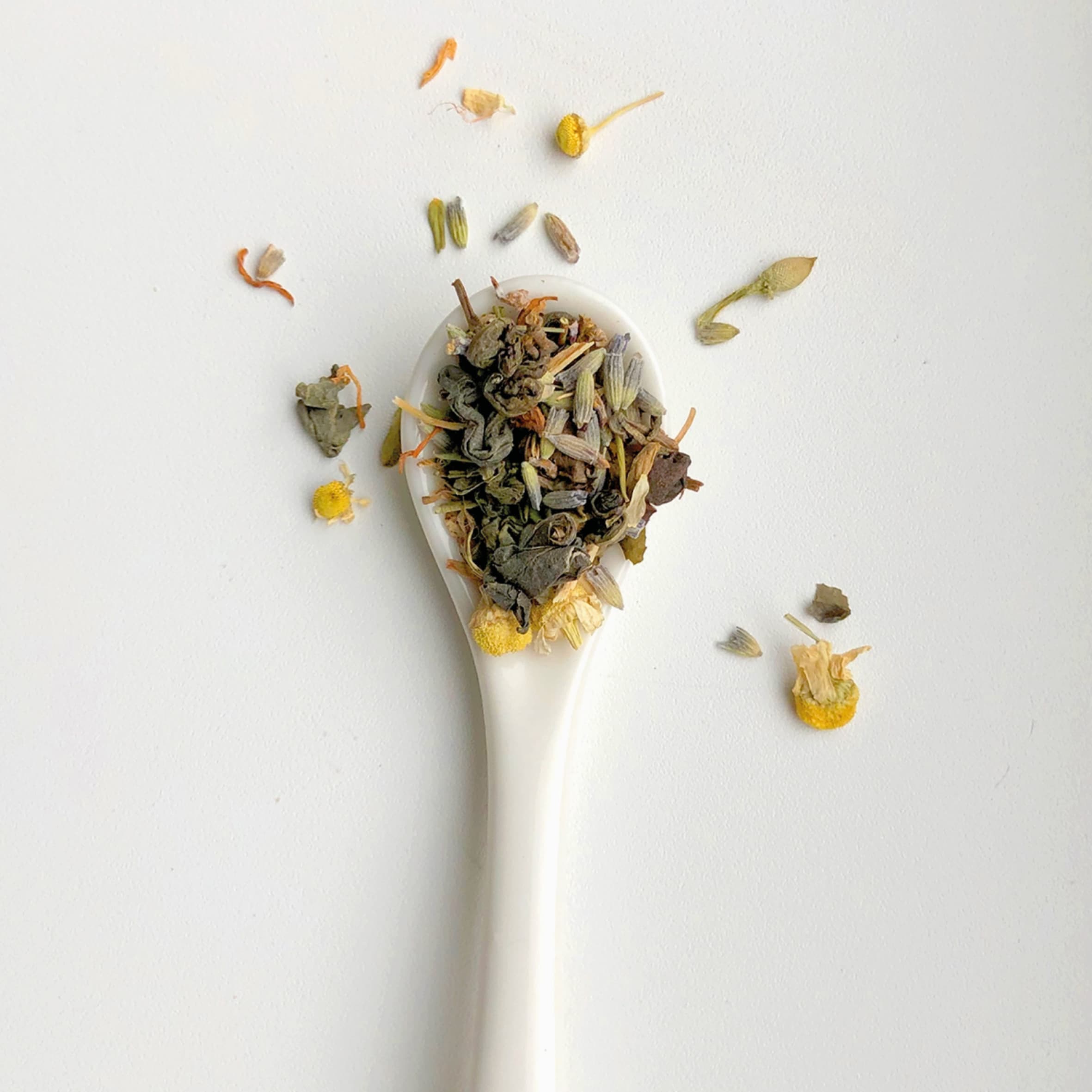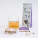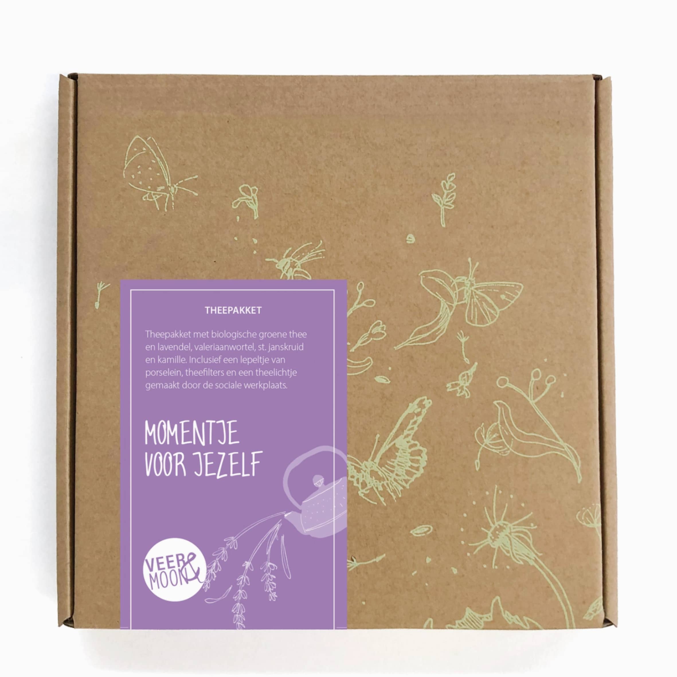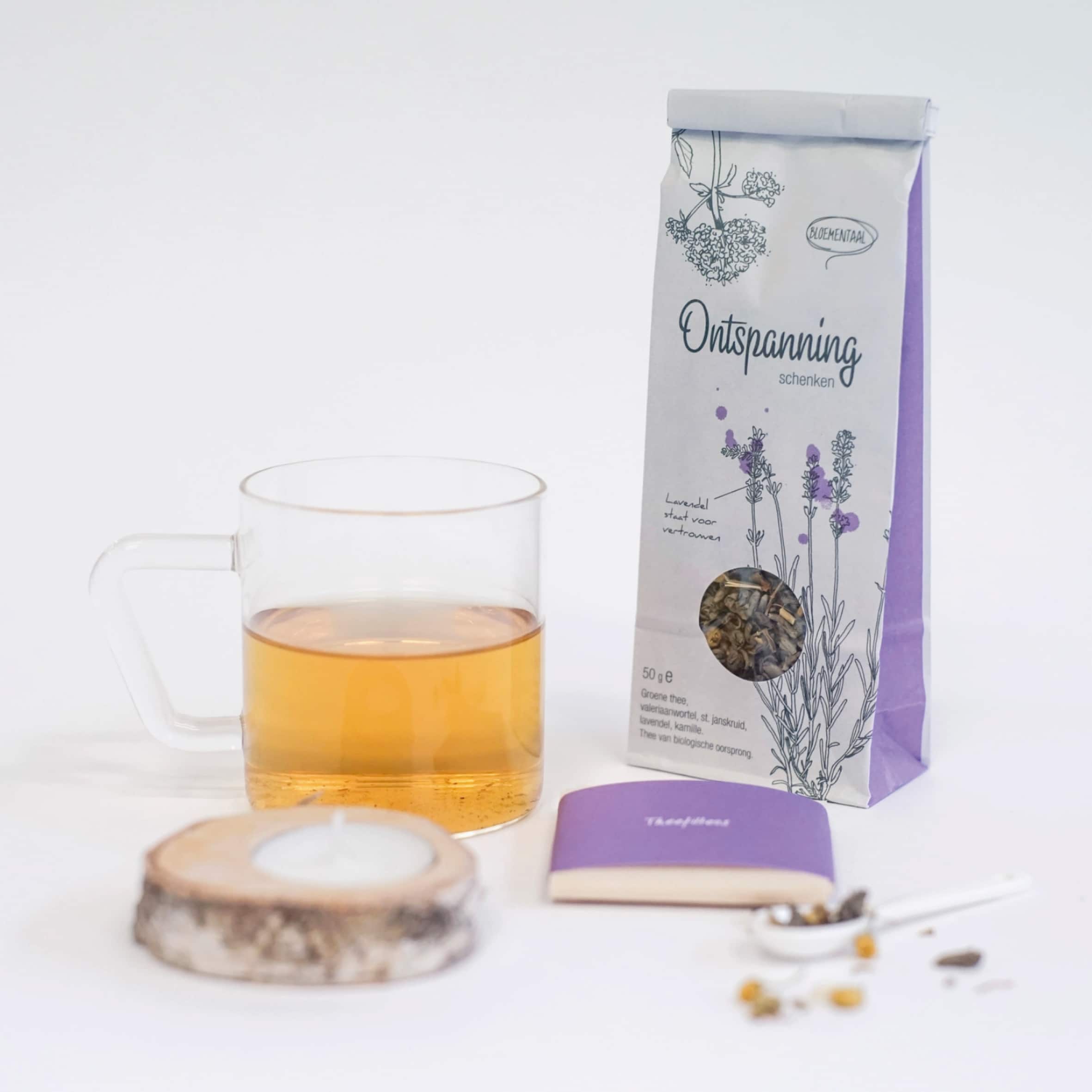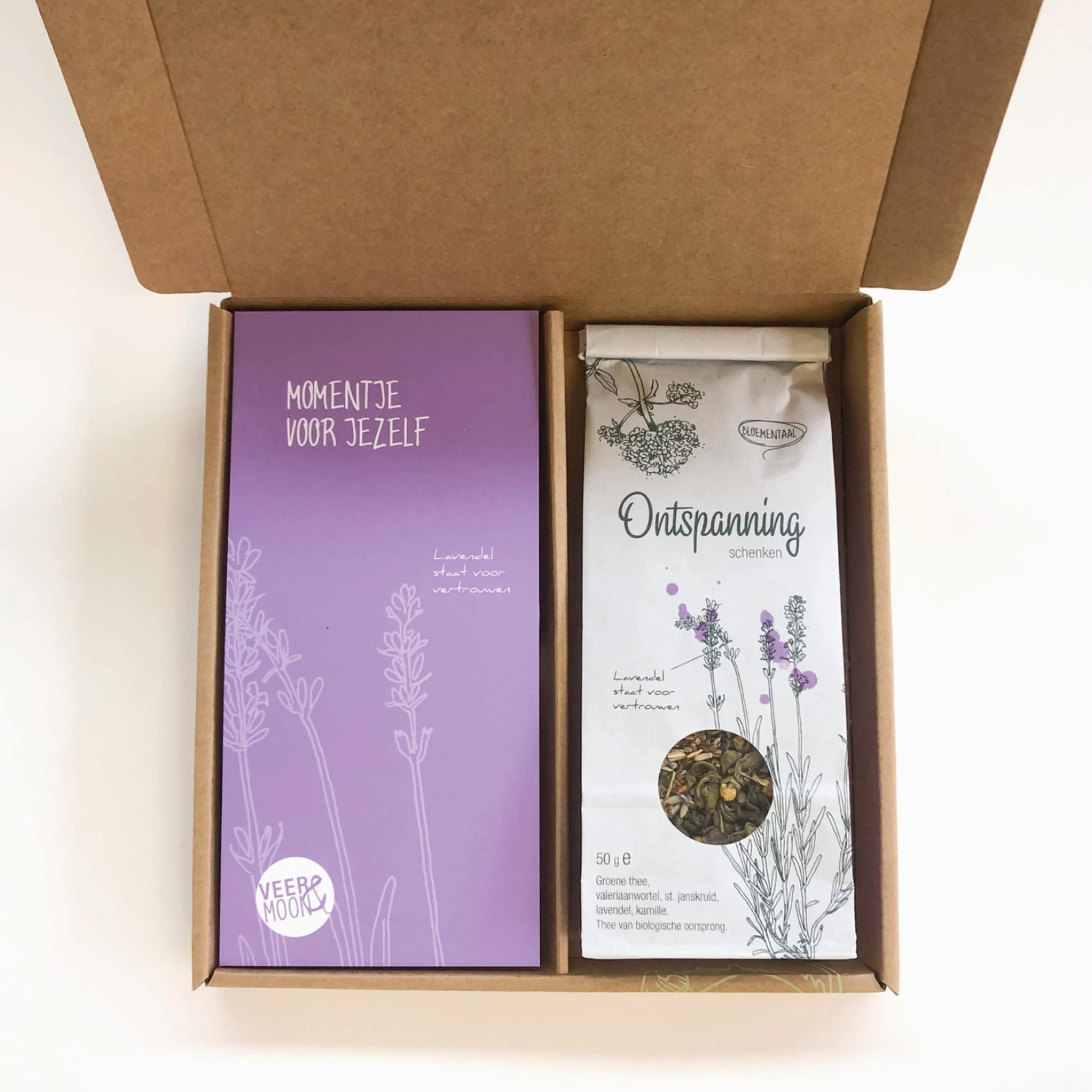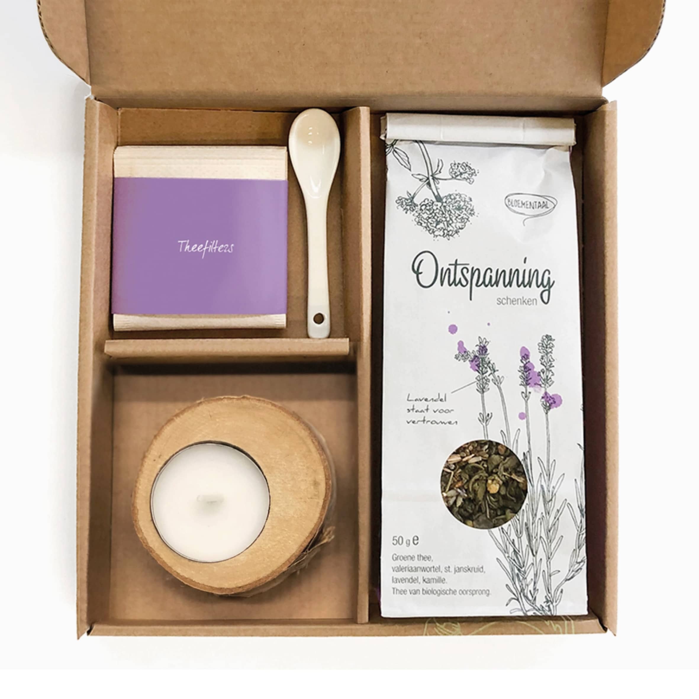 Cadeaupakketje dat door de brievenbus past. Met biologische groene thee en rustgevende bloemen: lavendel, valeriaanwortel st.janskruid, en kamille om te ontspannen. Inclusief theefilters, porseleinen lepeltje en theelichtje in een boomschijf houdertje. Het pakketje past door de brievenbus.